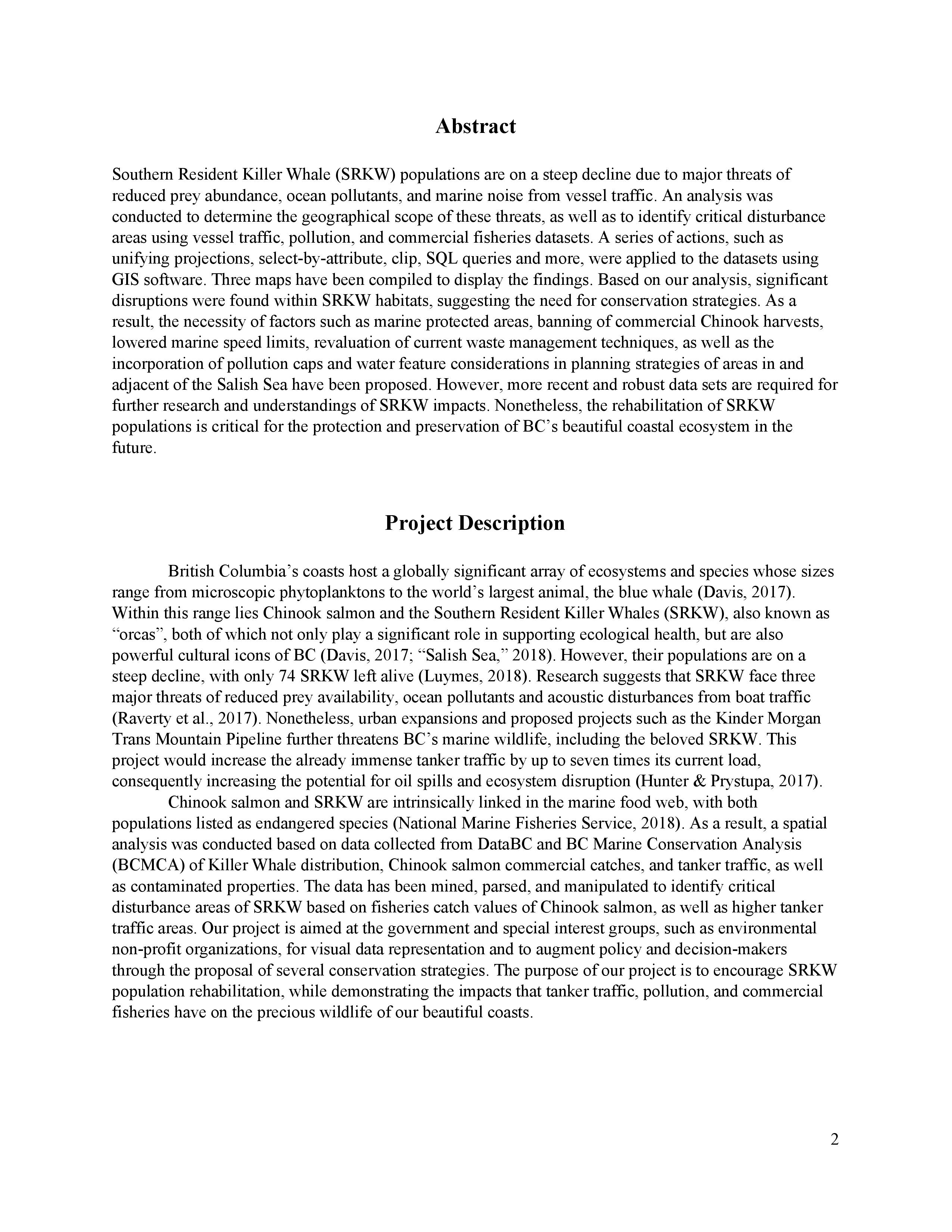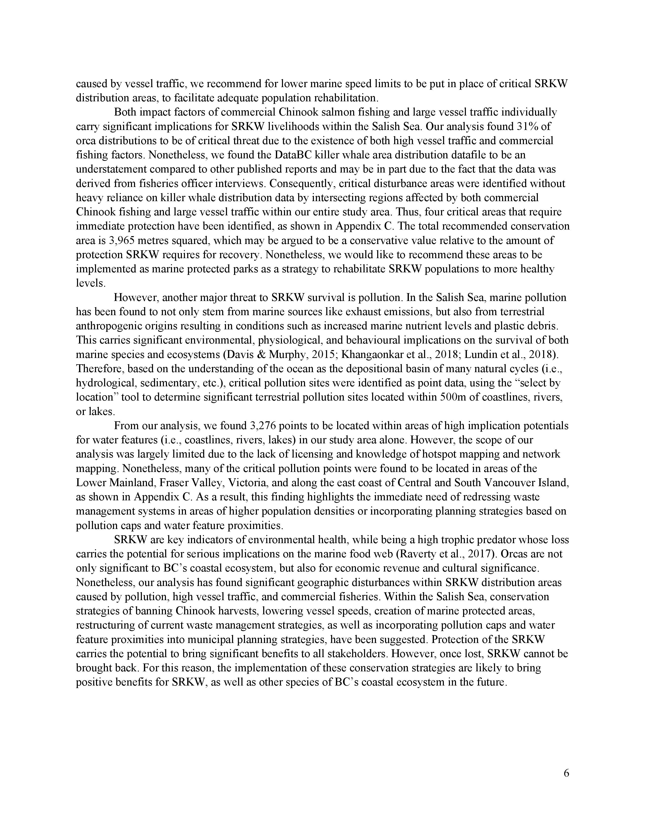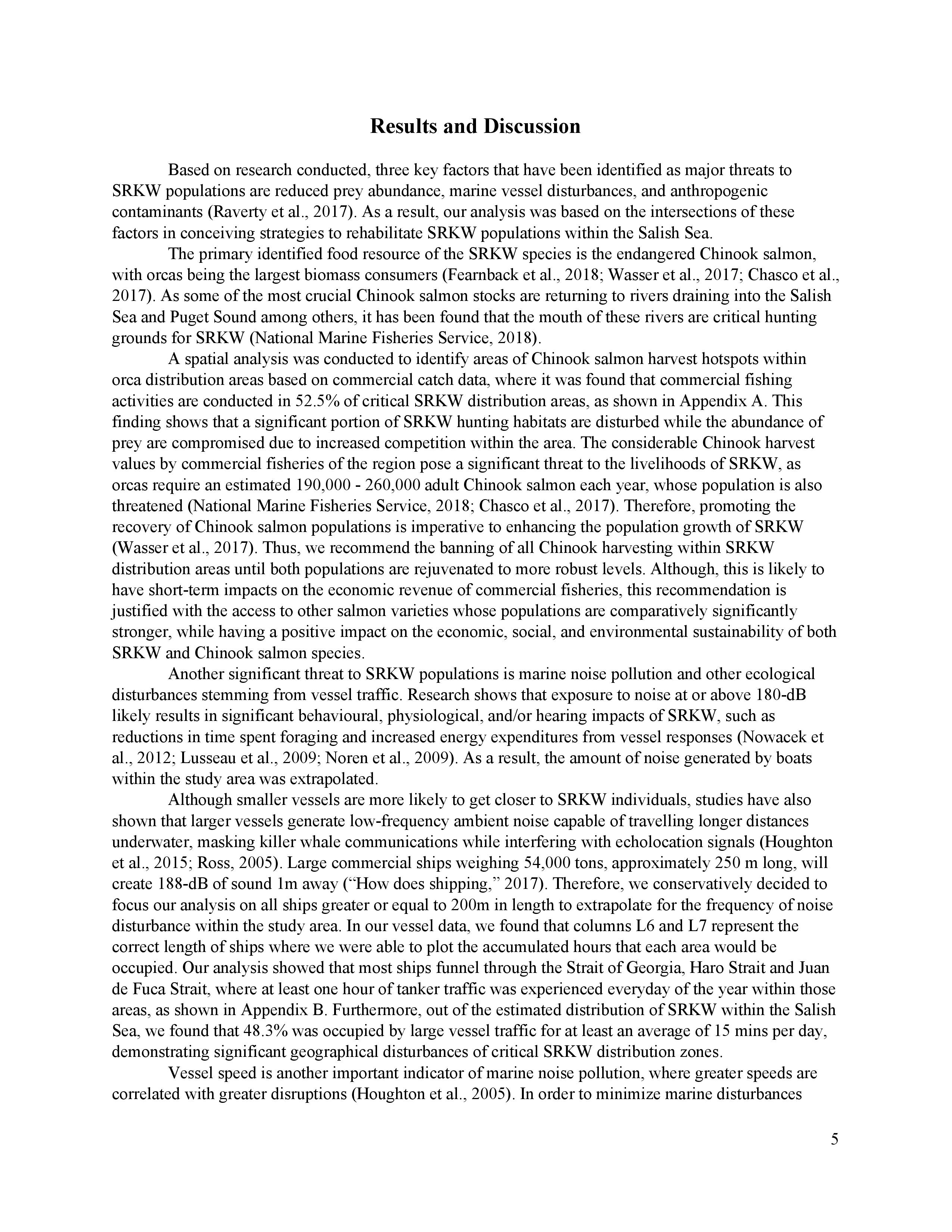 Chinook salmon and Southern Resident Killer Whales (SRKW) are intrinsically linked in the marine food web, with both listed as endangered species as each are on a steep decline, with only 74 SRKW left in the wild (Luymes, 2018; National Marine Fisheries Service, 2018). Research suggests that SRKW face three major threats of reduced prey availability, ocean pollutants and acoustic disturbances from boat traffic (Raverty et al., 2017).