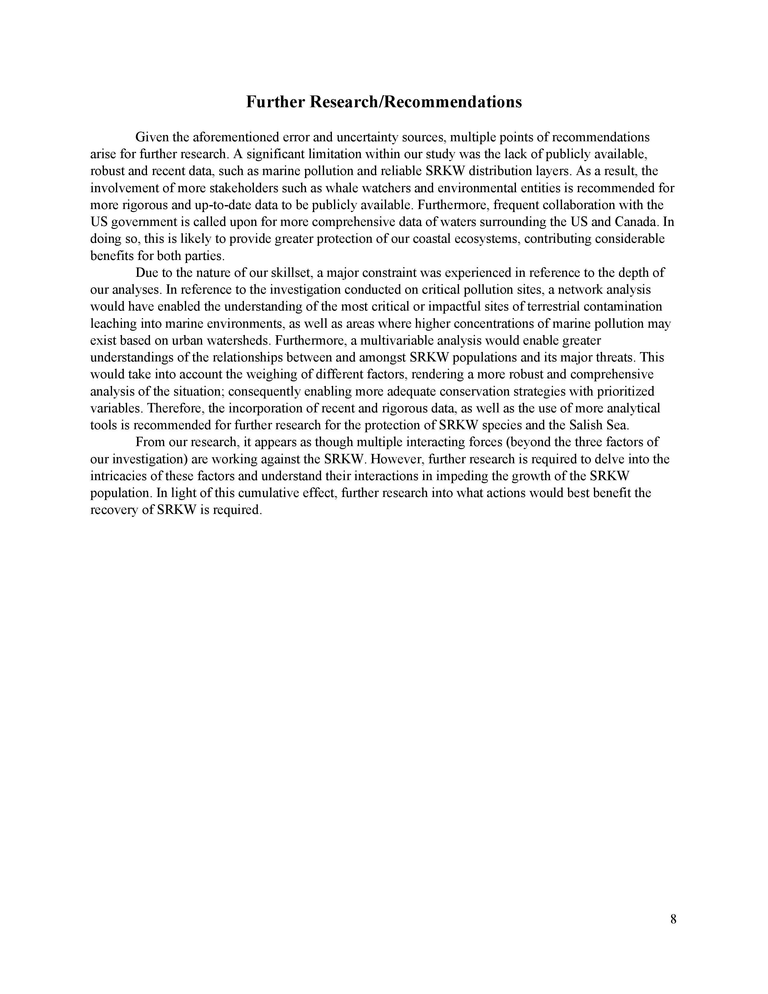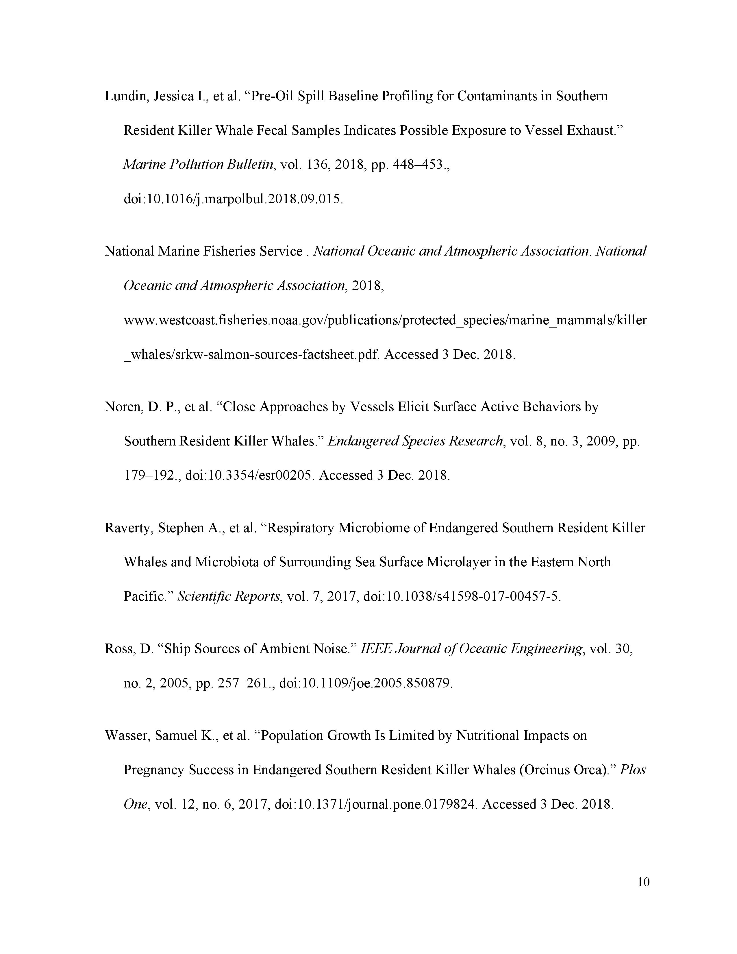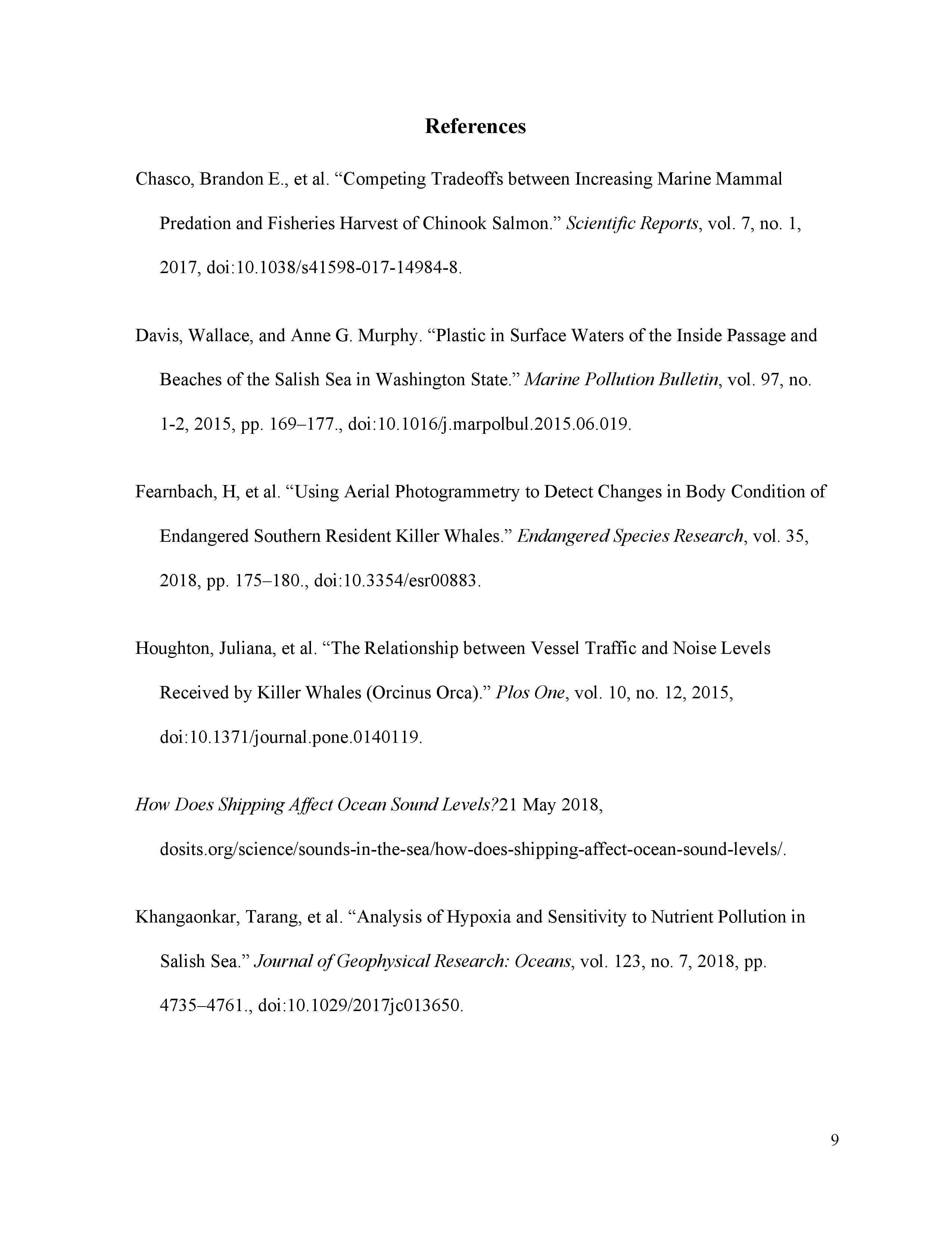 Chinook salmon and Southern Resident Killer Whales (SRKW) are intrinsically linked in the marine food web, with both listed as endangered species as each are on a steep decline, with only 74 SRKW left in the wild (Luymes, 2018; National Marine Fisheries Service, 2018). Research suggests that SRKW face three major threats of reduced prey availability, ocean pollutants and acoustic disturbances from boat traffic (Raverty et al., 2017).
