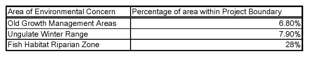 This assessment looks at three areas of environmental concern: Old Growth Management Areas (OGMA), Ungulate Winter Range (UWR) and Fish Habitat Riparian Zone (FHRZ). Streams above 555 m are given a FHRZ of 50 m and streams below 555 m are given a FHRZ of 100 m. Table 1 shows the percentage of area within the project boundary each of these sensitive areas covers. It has been found that ski resorts have negative effects on fauna reducing the abundance and diversity of birds, arthropods and mammals (Sato et al., 2014). The total area within the project boundary which is of environmental concern is 38%.