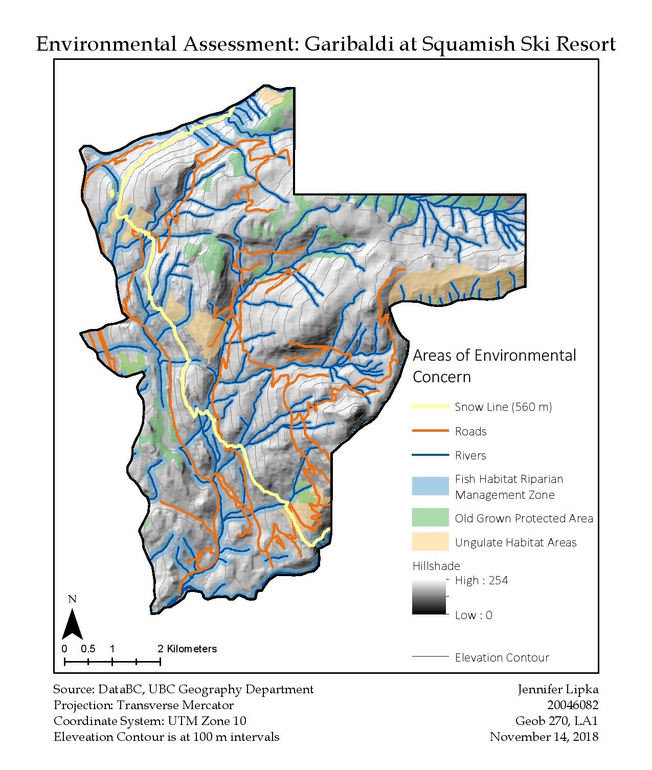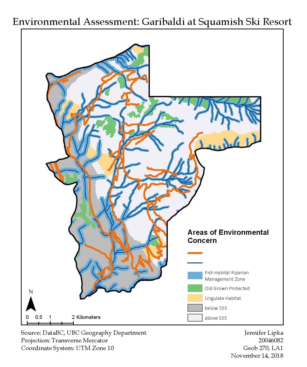 The assessment has been completed using data collected from DataBC. The assessment has been analyzed with ArcGIS software. The resort should not be developed on OGMA, UWR or FHRZ which are sensitive ecological areas for wildlife. Furthermore, it needs to be near a road and above 555 m. There is also slope and aspect for each ski run to consider as well.