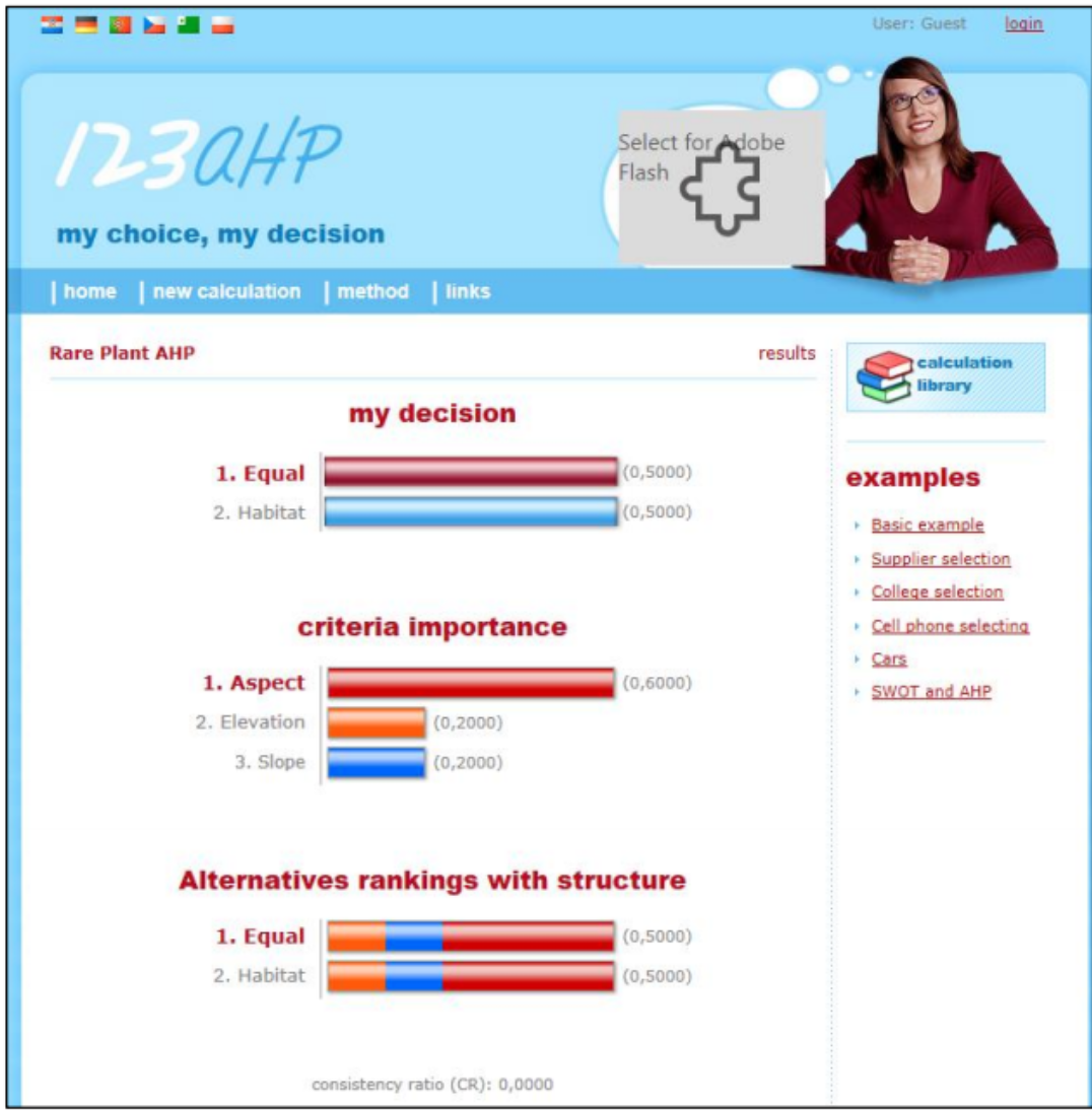 The botanist relayed that the Aspect is more important to the species than the slope or elevation and that both elevation and slope were equally important. Using this information, I performed an analytical hierarchical approach (AHP) and determined the relative importance to apply to each factor (See Figure 1). This means that in our Multi-Criteria Evaluation (MCE), a South facing aspect will be prioritized.